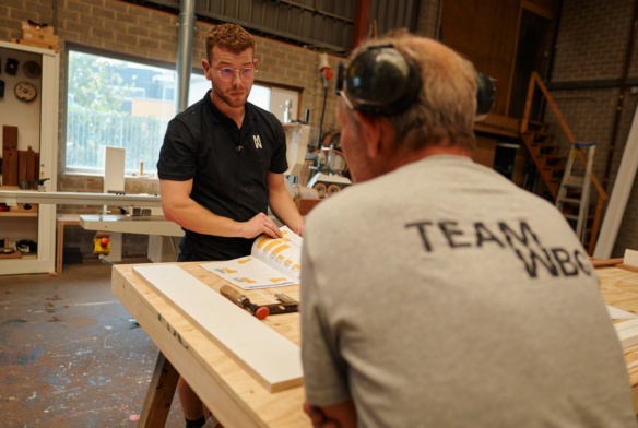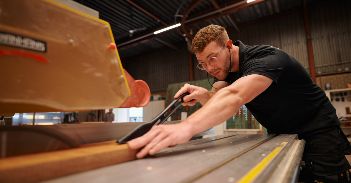 Lars Pennings over het vak leren in de werkplaats, maatwerkoplossingen en moaten die altijd helpen. Sinds 2022 werkt hij als timmerman in de timmerwerkplaats van TEAMWBC. Daar maakt hij houtwerk op maat voor allerlei projecten: van luxe villa tot spoedklus. Leren én doen, die combinatie past hem goed. Met hulp van ervaren collega’s ontwikkelde hij zich razendsnel tot echte vakman.